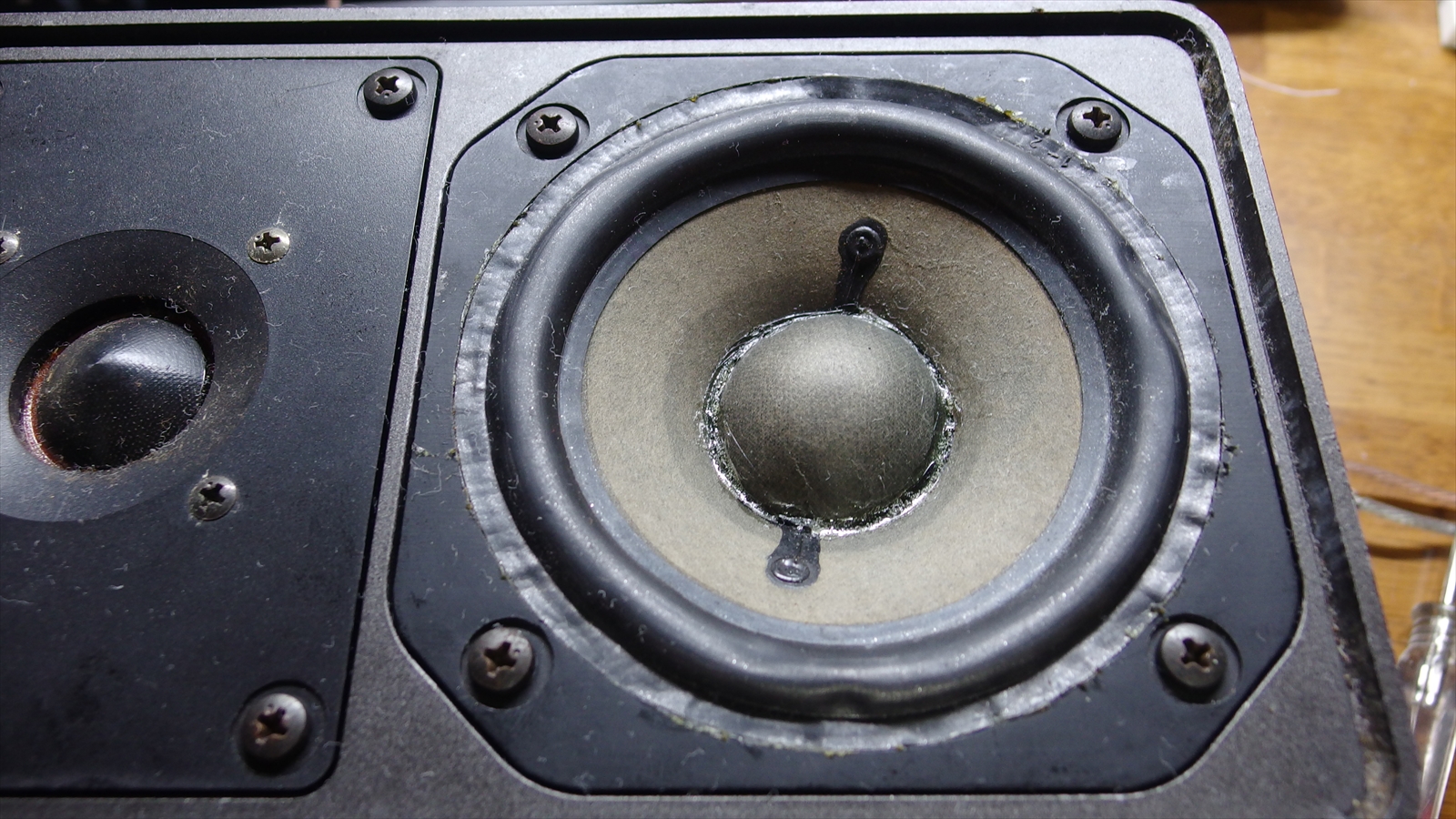 写真はこんな感じ。 設計ミスってエッジの丸みの部分が無い。 まぁそんなに大音量出さないし大丈夫だろうと思っていた。実際、小音量では問題なかった。 だがしかし、音量を上げていくと、ボッ、ボッ、というノイズが・・・。ちょうど、布を思いっきり引っ張ったときのような・・・。 はい、やり直しましたよorz やったことは前回と同じ、剥がして貼りなおす。 前回と違うのは内径を小さめに取ったのと、端材しか残っていなかったのでバウムクーヘンの繋ぎ合わせになったこと。コーンに張り付けるときは重石を載せてコーンを沈めた状態で。 で、できたのがこれ まぁそうですよね。常識的に考えてこれが正しい状態ですよね。。。 PR |