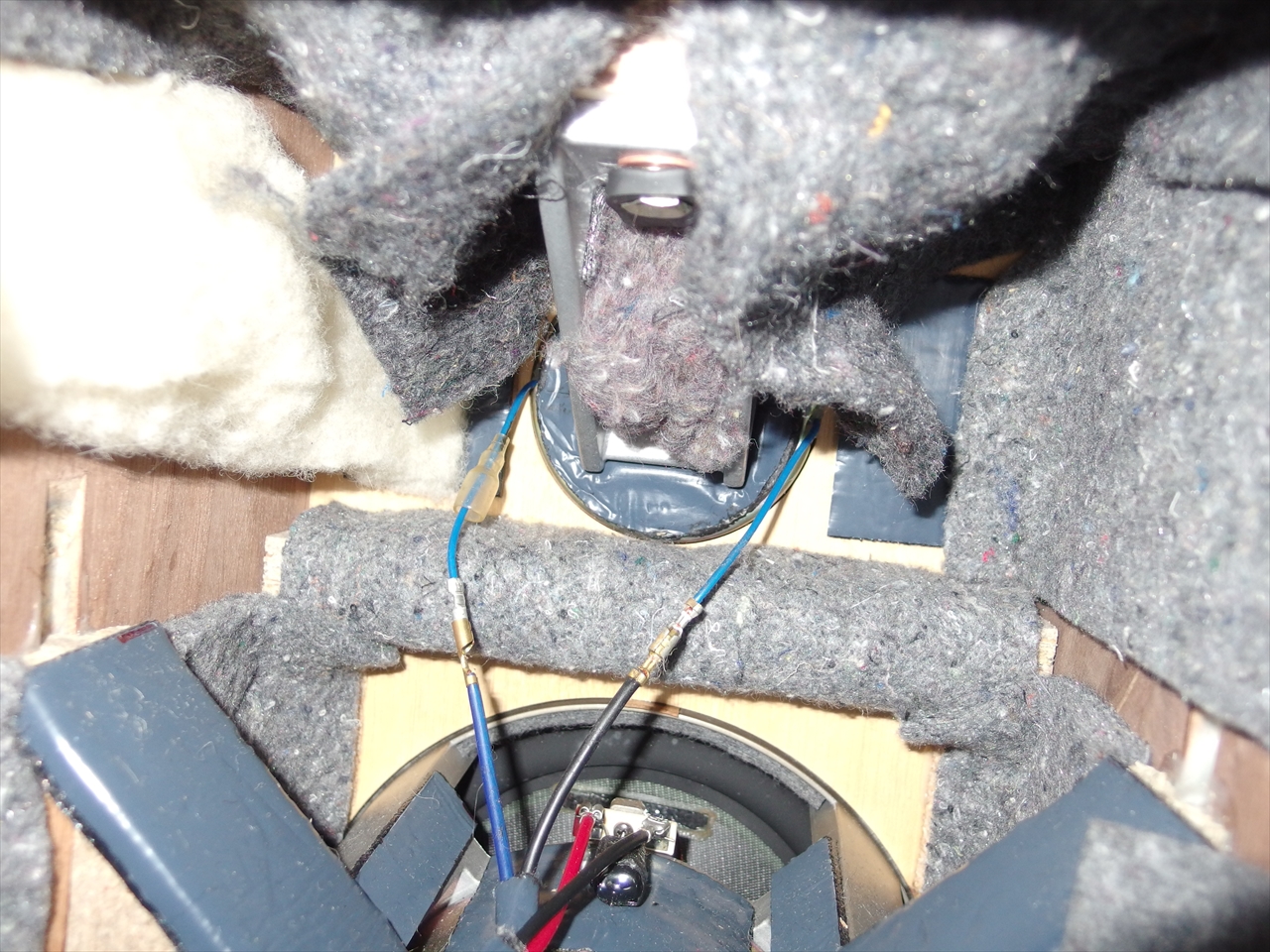 中身ウーファー側。X字の木にはこれでもかとブチルゴム。フレームにもこれでもかとブチルゴム。更には配線にもブチルゴム。。。一体どれだけ使えば気が済むのだw