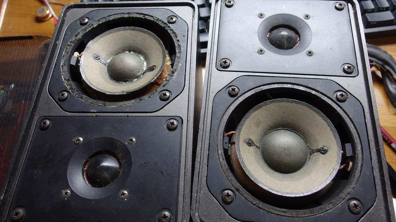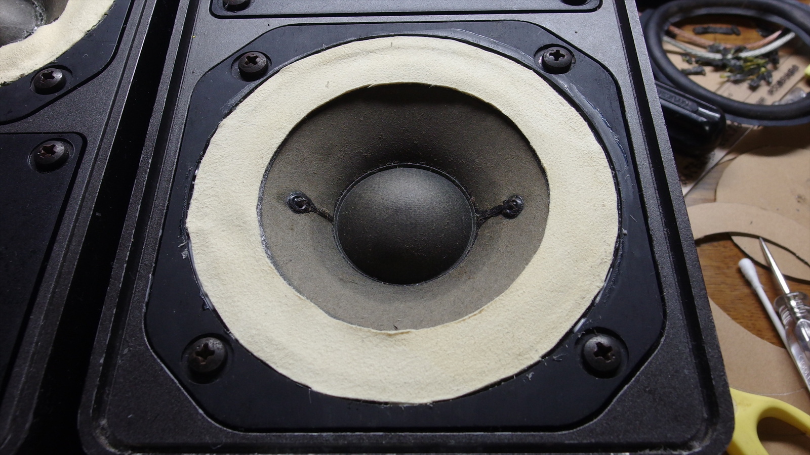まずはネットワーク。前もちょっと変えたが、今回は抵抗をTRITECのシリコン・セラミック抵抗に変更。前はTAKMANのセメント抵抗を使っていた。コンデンサがSOLENのフィルムコン、コイルが(多分)Jantzenの空芯と、どう見ても抵抗が残念な感じなので少々値は張るが思い切って交換。 効果は。。。ちょっとだけ高域のキレが良くなり、ボーカルがみずみずしくなったかな。という感じ。この段階ではまだ低音がもたついていて、若干他の帯域の邪魔をしているのが気になった。 ネットワーク弄ってクロスオーバを変えようと思うとかなりお金がかかってしまうので、一つの原因と思われるエッジを交換してみた。筐体はアルミダイキャストの鈍器系な上、ミニサイズだから箱鳴りは多分無いだろうし、もたつくとしたらエッジが原因だろうなーと。 素材はみんな大好き?セーム革。ヨドバシで売ってた時計手入れ用w。元のエッジはブチルゴム。調べてみるとゴムは量感は出るけどやっぱりスピード感は出にくいらしい。もちろん、量感とスピード感の両立が望ましいけど、どちらを優先するかと言えばスピード感。自分の好みっていうのもあるし、低音寄りだと、音量出すと他の部屋(主に一階のリビング)に響いて迷惑をかけるし。 というわけで、エッジ交換を竣工ー 元はこんな感じ。ジャンクで買って修理に出したときに一回剥がして付け直されてるのでちょっと歪んでいる。劣化してヒビが入ってたり固くなってたりということは無いっぽいけど、表面がカサカサしている。30年以上前のスピーカーだけど、ブチルゴムってこんなにもつものなのかと思い、調べてみたら耐候性はかなり高いらしい。それにしても30年はすげぇw というわけでまずは元のエッジを剥がす作業。 参考にしたサイトではエッジがウレタンなので綺麗に除くのが大変だと書いてあったが、これはブチルゴムなので剥がすだけ。とはいえコーンに貼ってある方は慎重にやらないと破れてしまう恐れがあるので慎重に。錐を使ってちょっとずつ剥がしていく。 剥がし終わった状態がこんな感じ。もう後戻りはできませんw ここで、セーム革の切り出し。型紙にコンパスで円を描いて切り取り、それを革に重ねて鉛筆でなぞる。大きさは、ユニットの外径が102mm、内径が74mmだったので、外径100mm、内径70mmで切った。外径は、参考にしたサイトに書いてあったが、ちょっとでも大きかったりして歪むと嫌だったので若干小さめに。内径は。。。まぁ、あれですよ。 切り終わったらいよいよ貼り付け。 まずは外側から。木工用ボンドを外側の張り付ける部分に万遍なく塗って皺にならないようにペタペタ。思いの外簡単だった。まぁ、20cmとかのウーファーだとこうもいかないんだろうけど。 外側だけ貼ったところ。 乾くまで暫く待ってから内側。コーンの裏側に貼るパターンもあるようだけど、今回は元のやり方に合わせて表に。 今度はコーンに、小さいヘラでちょっとずつボンドを塗って張り付けていく。 小さいヘラは型紙を細く切っただけですハイ。 出来たのがこんな感じ。 え?エッジに丸みが無い? これはほら、あえて低音を少なくしyどう見ても設計ミスです本当にありがとうございましたorz (追記:ノイズが出たのでやっぱり貼りなおしました。こちら) まぁ、何はともあれ一応完成。暫く乾かした後小音量で試聴。 ・・・うん、キタコレw 良い感じで低音のもたつきが抑えられたうえ、ボーカルがさらに艶やかに。 低音の量感は少なくなったけど、これだけあれば十分なレベル。素晴らしい。 思ったより簡単にエッジ交換ができたので、安心してエッジ割れのジャンクスピーカーも落札できるよ!やったねw 元々は抵抗とエッジを交換するだけのつもりだったんだけど、ヨドバシで材料を買ってるときに、ふと吸音材用の炭を入れてみようと思い立ったので購入。2.5kgで600円ぐらい。そんなに良いものは高くて買えませんw 炭は電気を通すので、絶縁だけは注意して、入れてみた結果、、、高域の伸びが良くなったかな?入れて鳴らし始めた直後は高域が強くなり過ぎた感じがしたが、暫くならしていたら丁度よくなってきたような。 結構改造を入れて、かなり良くなってきた感じがするので、暫くこのまま行ってみようと。。。というか、これ以上の改造だとホントにユニット自体を交換したり、ネットワークの組み直しになったりするので、あんまりやりたくない。金無いしw しかし、購入金額+修理代で4000円ぐらいなのに、今回の改造で改造費が合計15000円ぐらいになってしまったw まぁ、それだけの価値はあったんじゃないかと思うけどね。 |