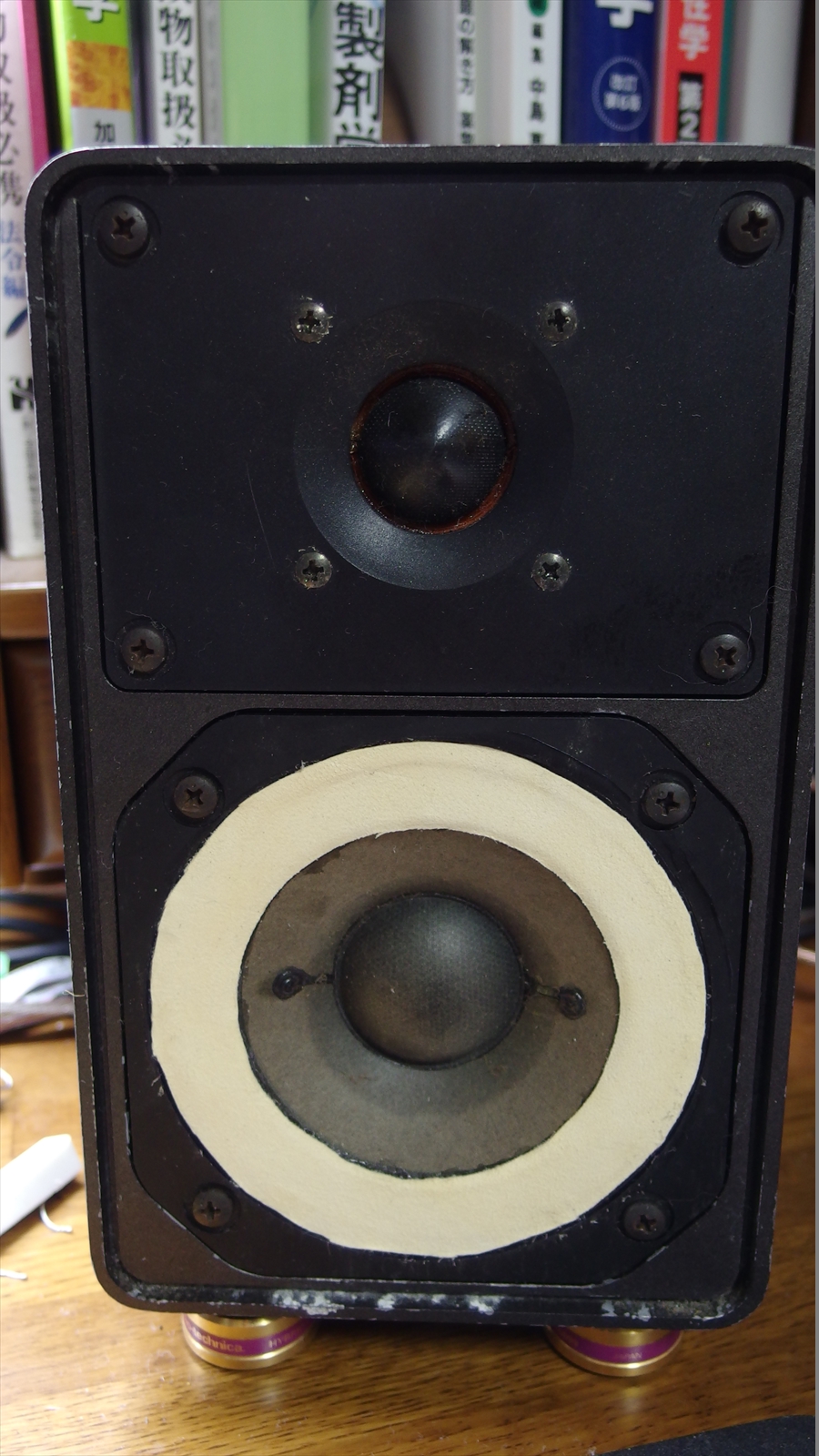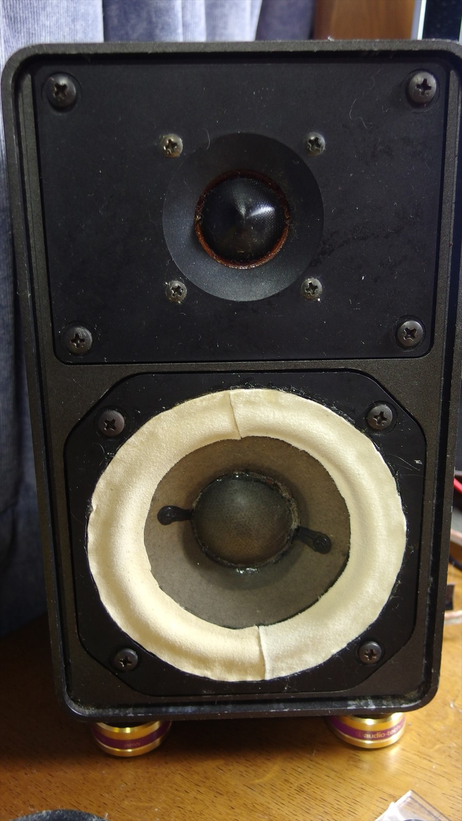 写真はこんな感じ。 設計ミスってエッジの丸みの部分が無い。 まぁそんなに大音量出さないし大丈夫だろうと思っていた。実際、小音量では問題なかった。 だがしかし、音量を上げていくと、ボッ、ボッ、というノイズが・・・。ちょうど、布を思いっきり引っ張ったときのような・・・。 はい、やり直しましたよorz やったことは前回と同じ、剥がして貼りなおす。 前回と違うのは内径を小さめに取ったのと、端材しか残っていなかったのでバウムクーヘンの繋ぎ合わせになったこと。コーンに張り付けるときは重石を載せてコーンを沈めた状態で。 で、できたのがこれ まぁそうですよね。常識的に考えてこれが正しい状態ですよね。。。 PR |